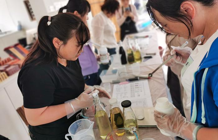 在專業(yè)芳香師的指導(dǎo)下,參加活動的職工兩人一組、通力配合,在掌握精確的溫度和重量后,大家在量杯中有序地加入各種原料和自己喜歡的精油,通過持續(xù)攪拌,神奇的化學(xué)反應(yīng)給大家?guī)砹梭@喜,皂液倒入模具后呈現(xiàn)的各種形狀也讓人賞心悅目。