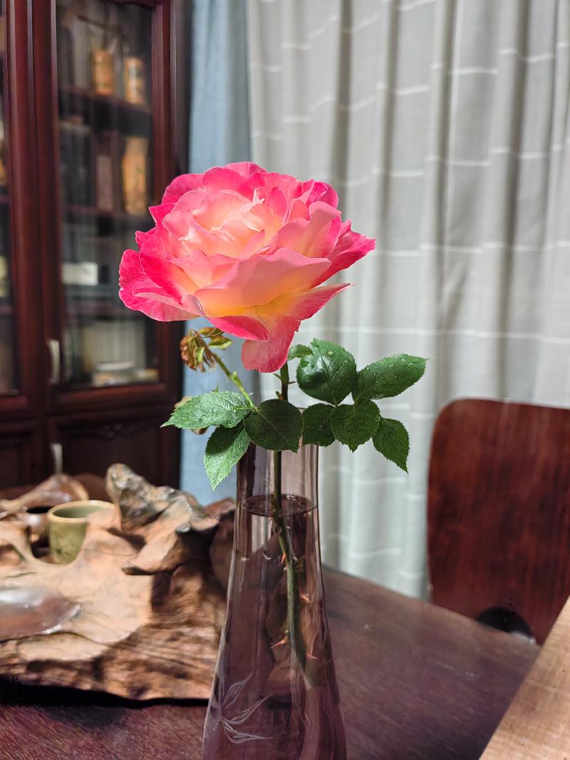 陽臺(tái)上的薔薇開了,