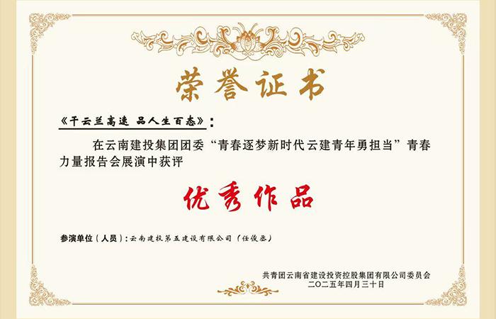 2025年五四青年節(jié),集團舉辦“青春逐夢新時代 云建青年勇?lián)敗鼻啻毫α繄蟾鏁?。展演中,由公司團委、市政路橋四部聯(lián)合編創(chuàng)的脫口秀《干云蘭高速,品人生百態(tài)》作品獲評“優(yōu)秀作品”。
