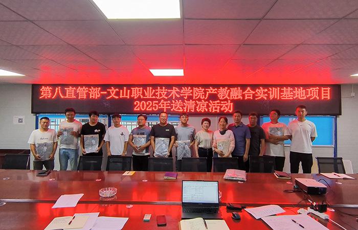 7月18日,第八直管部工會到文山職業(yè)技術(shù)學(xué)院產(chǎn)教融合實(shí)訓(xùn)基地項(xiàng)目開展2025年送清涼活動,為堅(jiān)守一線職工發(fā)放了防曬服,送上直管部工會最真摯的關(guān)懷?;顒又行麄鹘庾x《云南省總工會關(guān)于建立健全幫扶長效機(jī)制的意見》文件內(nèi)容,向參會人員普及《防暑降溫小貼士》知識,提醒廣大職工及產(chǎn)業(yè)工人密切關(guān)注天氣變化,做好高溫天氣下生產(chǎn)、生活作業(yè)防暑降溫措施的準(zhǔn)備。活動上提出,一是直管部工會和項(xiàng)目部將聯(lián)動開展工作,加強(qiáng)對項(xiàng)…